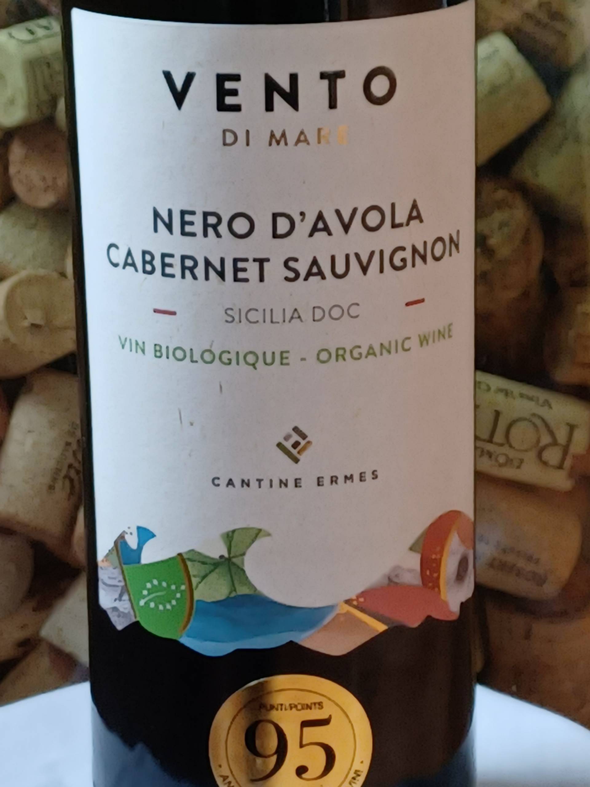 Le nom du vin signifie « vent de la mer », puisque celui-ci est omniprésent sur l’île de la Sicile en Italie. Le typique cépage néro d’avola, très présent dans cette région, compose 80% de l’assemblage que complète le cabernet sauvignon. Il est à noter que ces raisins sont cultivés en mode BIO.