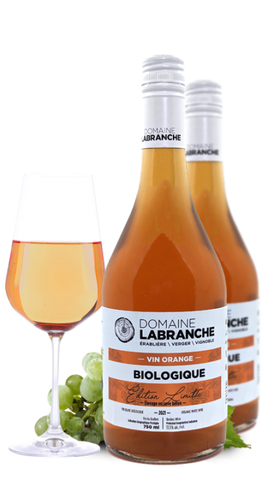 J’ai eu le plaisir de déguster son nouveau vin orange. Ici la mention « Édition limitée » signifie que seulement 1000 bouteilles ont été produites! Il s’agit d’une macération pelliculaire des cépages Frontenac blanc (81%) que complète le Frontenac gris. D’une teinte orange brulée, il offre des notes de fruits exotiques (tel l’ananas) et d’écorce d’orange. En bouche, ce vin sec, à l’acidité bien présente, se combine à une légère astringence (légère rugosité sur la langue, comme les vins rouges) et une pointe d’amertume. Il accompagnera des plats aromatisés au cari ou des plats asiatiques. Vous remarquerez que le vin est légèrement trouble. Cela n’est pas un défaut, il n’est tout simplement pas filtré afin de préserver les arômes. Faites vite les quantités sont limitées.