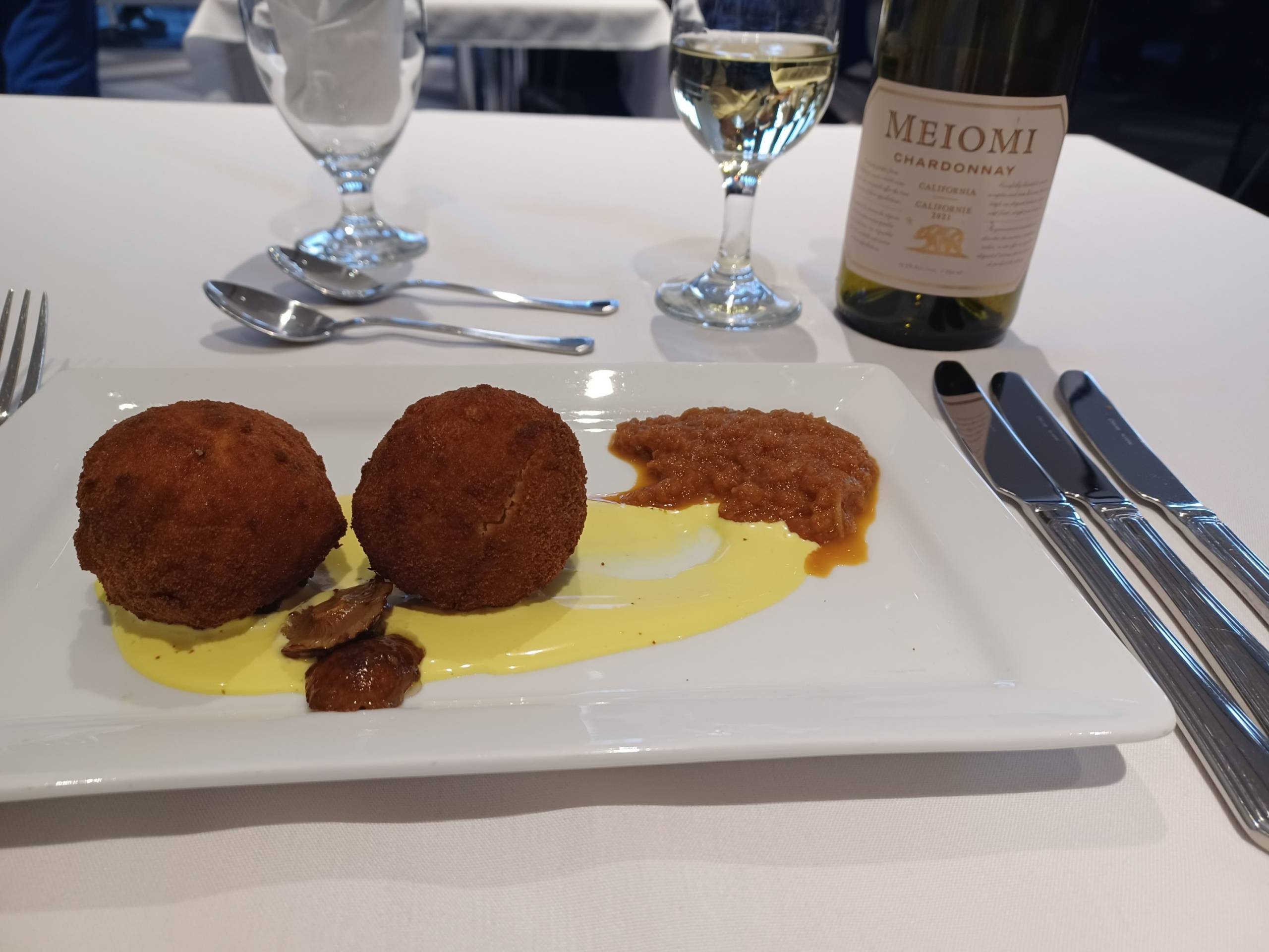 Pour accompagner l’arancini aux champignons, j’ai choisi de servir ce chardonnay de la maison californienne Meiomi. D’une belle couleur dorée, il offre au nez des notes de pêches, de vanille et un boisé pas trop envahissant. Sa texture légèrement grasse et bien équilibrée par une acidité rafraichissante, il a très bien accompagné ce plat.