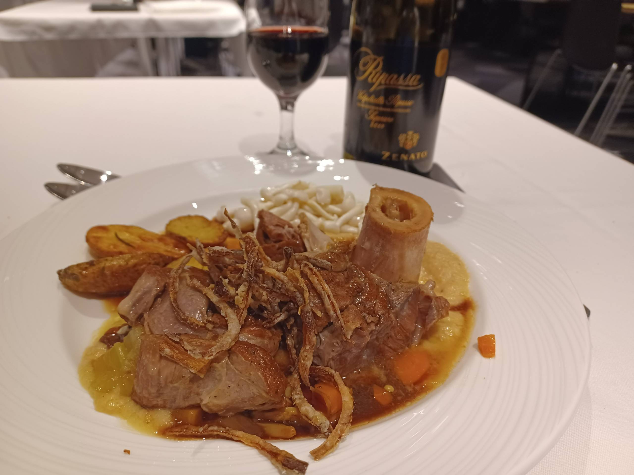 L’osso buco de veau accompagné d’une sauce demi-glace et de pommes de terre Gabrielle de même que des pommes et oignons caramélisés constituait le plat principal. Il y avait donc plusieurs saveurs à harmoniser. J’ai choisi un Valpolicella ripasso pour accompagner ce plat savoureux.
