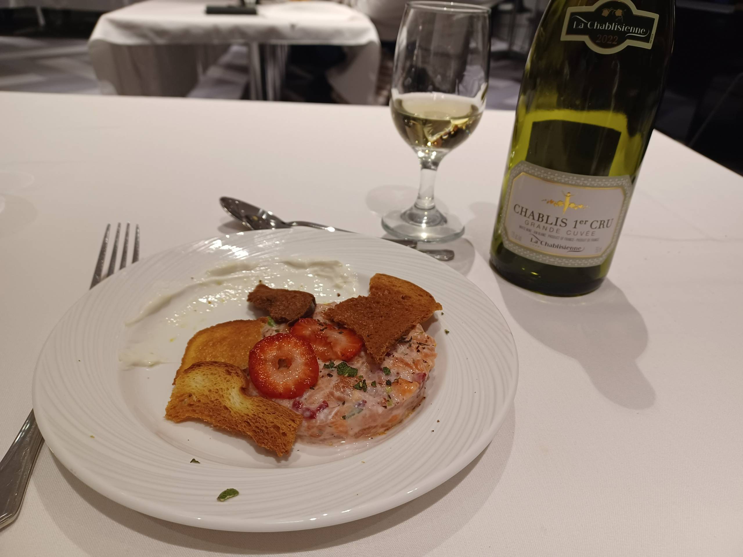 J’ai choisi un autre chardonnay pour accompagner le tartare de truite aux fraises. Produit par la cave coopérative La Chablisienne, de la région de Chablis en France, il s’agit d’un tout autre genre de chardonnay. Ici l’acidité est plus mordante puisque la région de Chablis est plus au nord et donc avec des températures plus fraîches. Ainsi, au nez, les notes de pomme verte, une touche florale et une belle minéralité, caractéristique de cette région, étaient invitantes. Son acidité a bien accompagné le gras de la truite et la fraicheur de la fraise. Un accord très bien réussi.