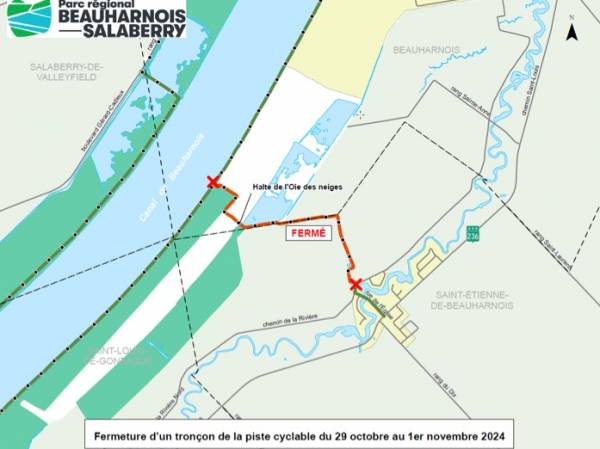 Le tronçon de la piste cyclable du Parc régional de Beauharnois-Salaberry, entre Saint-Étienne-de-Beauharnois et la piste en bordure du canal de Beauharnois, sera fermé du 29 octobre au 1er novembre.
