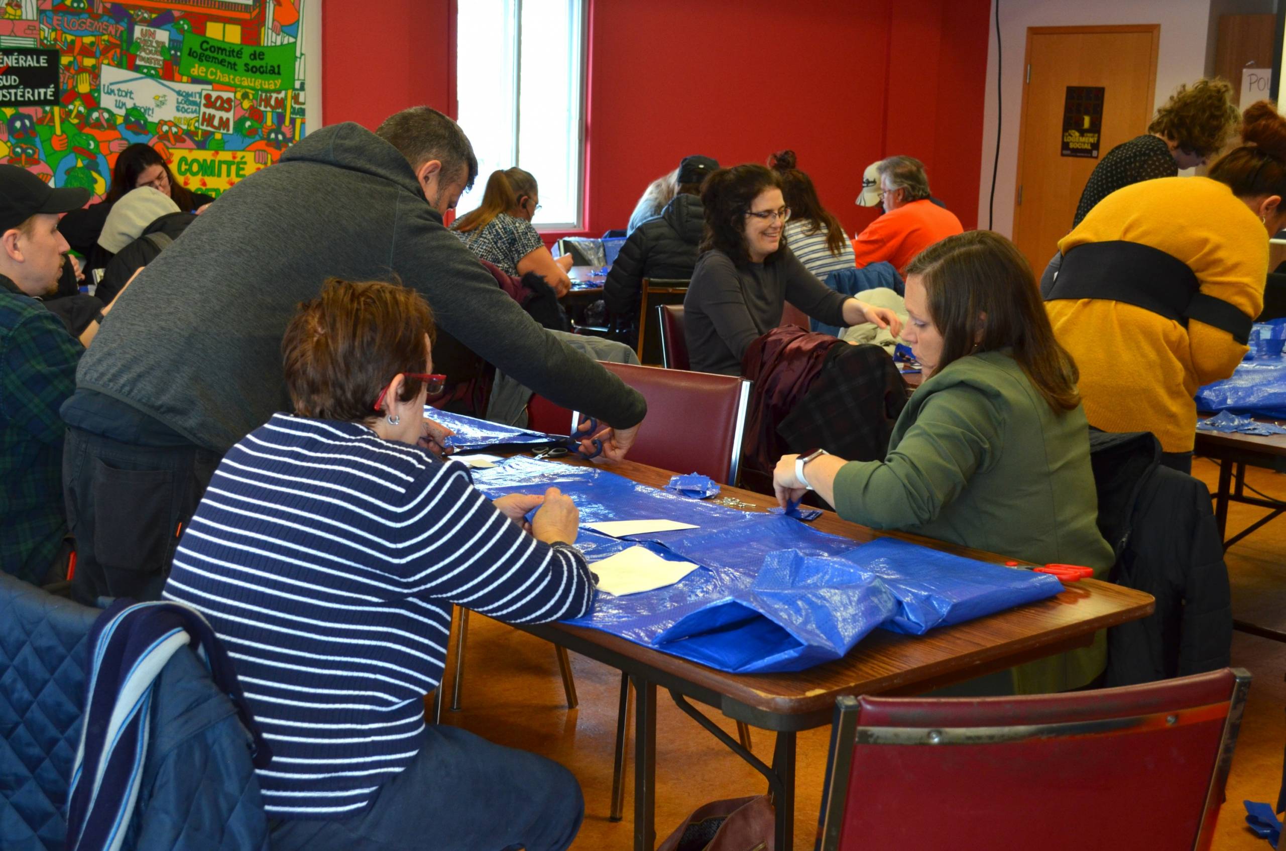 Le 3 décembre, en matinée, des organismes et membres soutenant la cause du droit au logement ont découpé plus de 3000 carrés bleus à être distribués dans la population. (Photo:Gracieuseté)