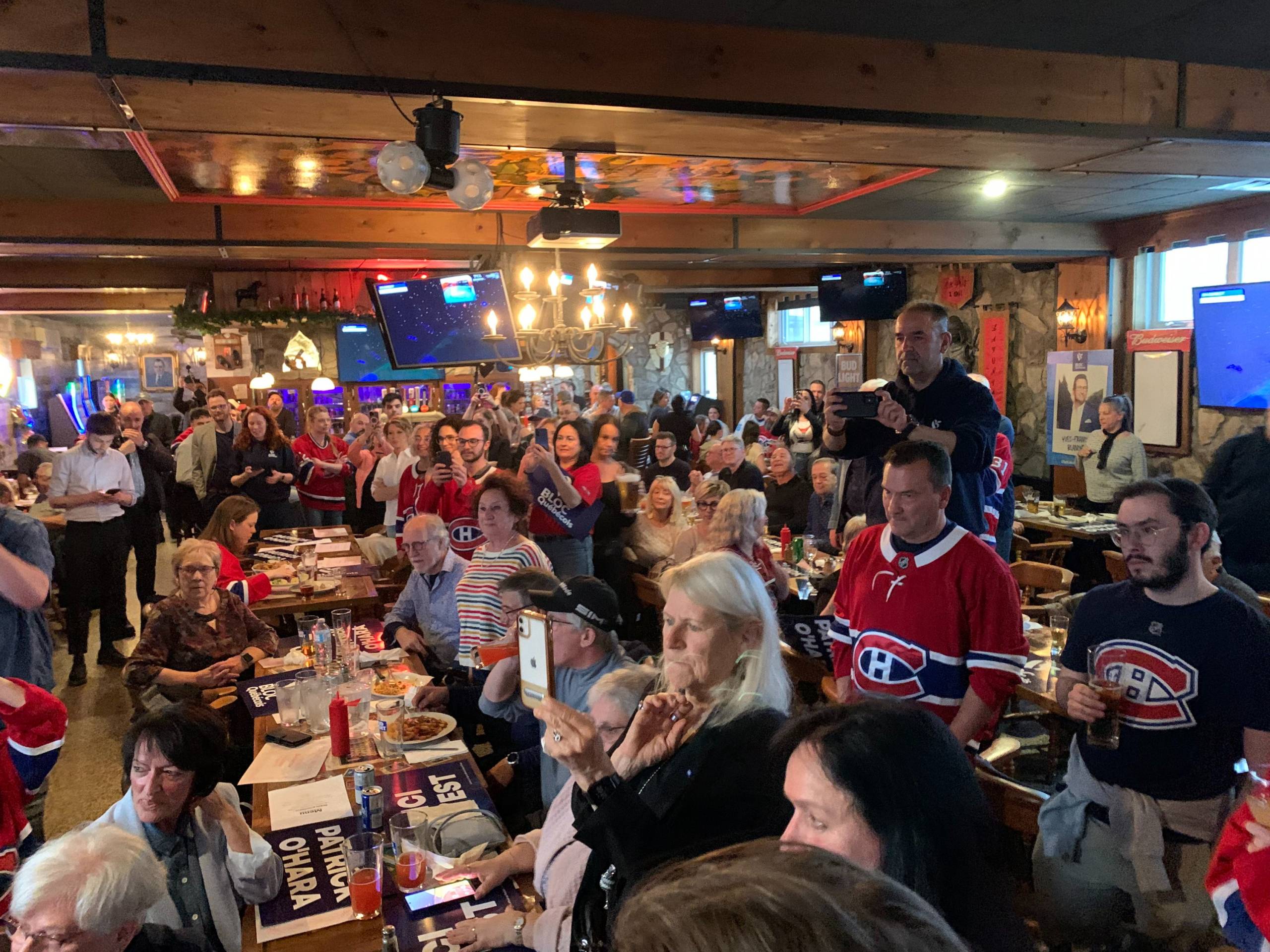 L’ambiance était à la fête à la brasserie Lafontaine lorsque Yves-François Blanchet est arrivé un peu avant le début du match en compagnie du candidat bloquiste dans la circonscription Châteauguay—Les Jardins-de-Napierville Patrick O’Hara.