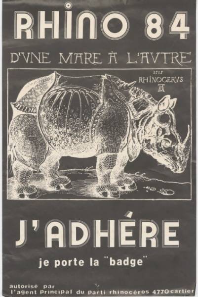 DÜRER, Albrecht, Rhino 84, d’une mare à l’autre : j’adhère, je porte la badge, affiche, 51 x 33 cm, Montréal, Parti Rhinocéros, 1984.