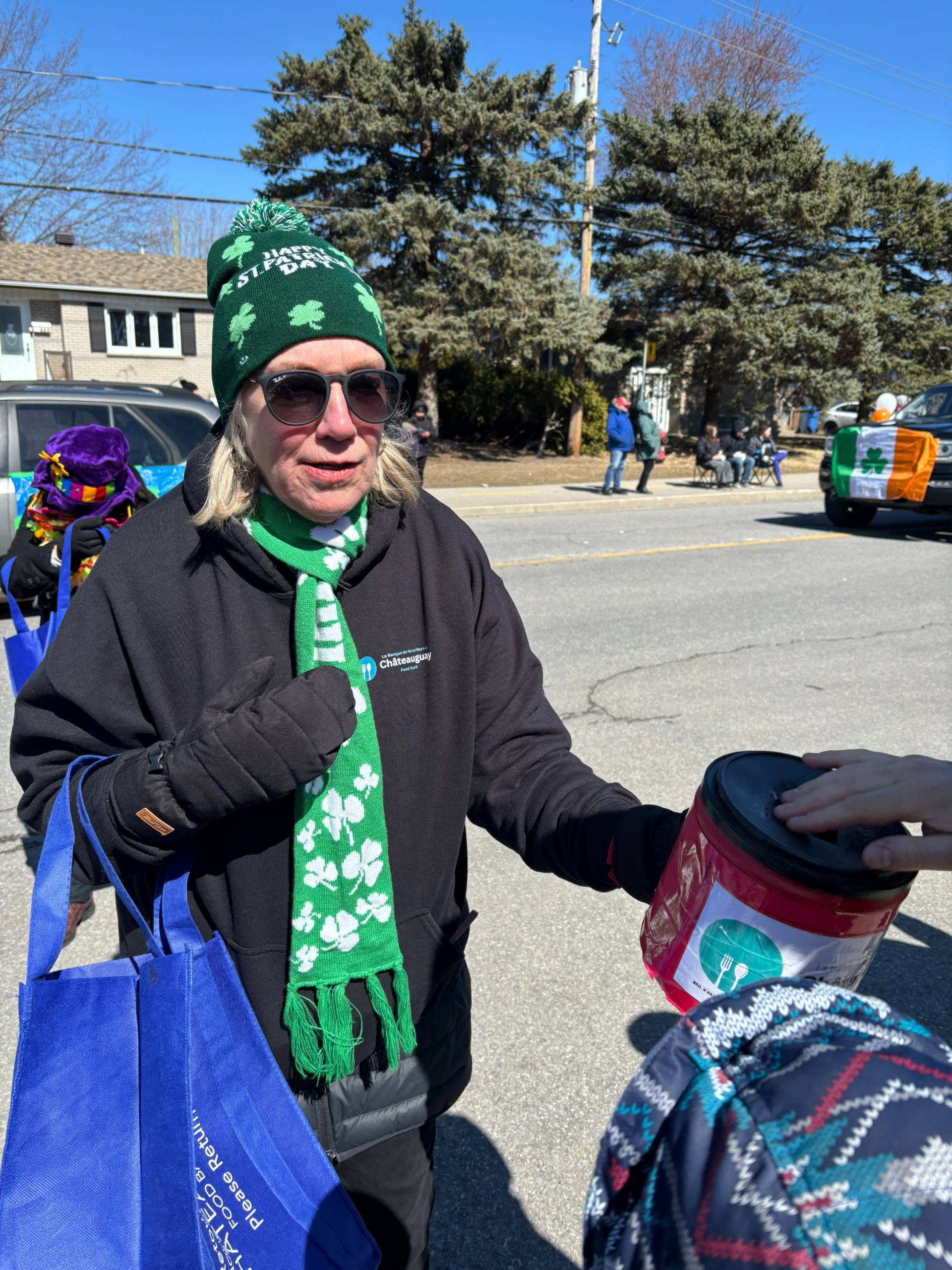 Des bénévoles de la Banque de nourriture de Châteauguay amassaient des dons pendant le défilé. (Photo : Le Soleil – Valérie Lessard)