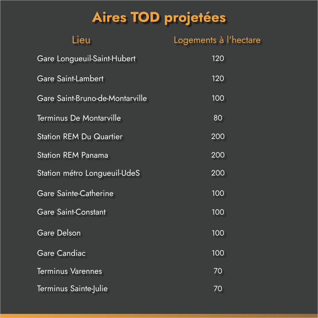 Pour le moment, on retrouve 7 aires TOD dans l’agglomération de Longueuil, 4 dans le Roussillon et 2 dans la MRC Marguerite-D’Youville. On retrouve ensuite 6 corridors aménagement-transport dans l’agglomération de Longueuil et 3 dans le Roussillon, ainsi que 10 espaces stratégiques de développement dans l’agglomération de Longueuil, 7 dans le Roussillon et 1 dans la MRC Marguerite-D’Youville.