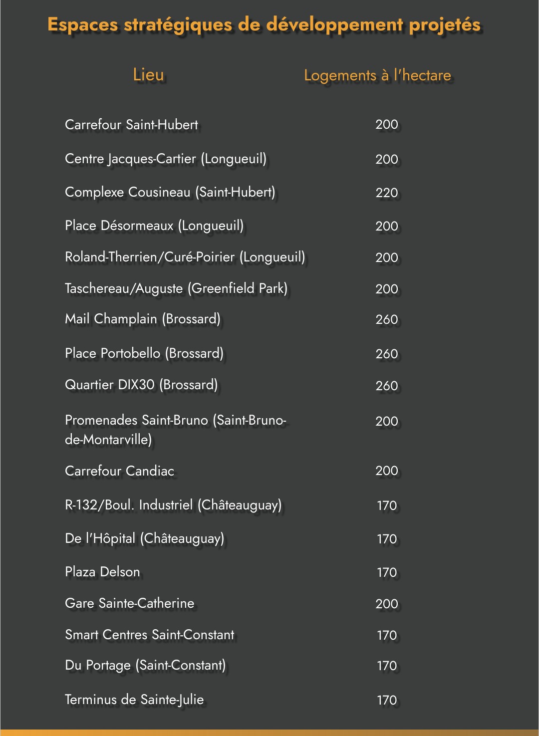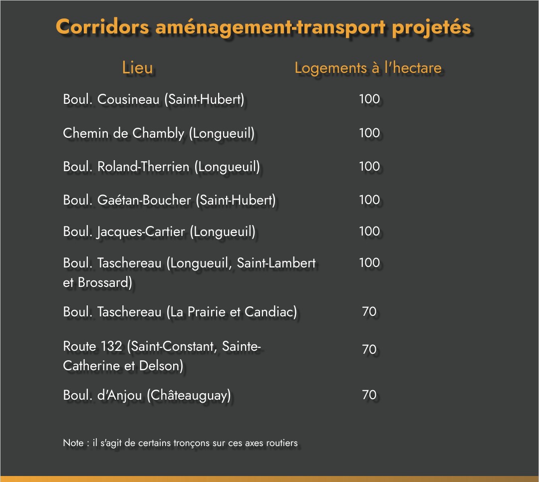 Certes, ces secteurs sont encore présents, avec des cibles de densité plus importantes (voir tableau plus bas), mais ils sont aussi accompagnés par deux nouveaux concepts : les corridors aménagement-transport et les espaces stratégiques de redéveloppement.