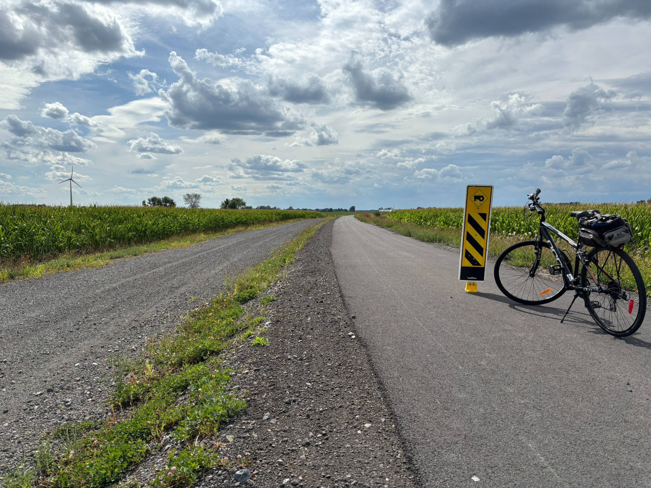 Le tronçon longe des terres agricoles. Une bande en petites roches parallèle à la piste cyclable est réservée au passage des agriculteurs. (Photo : Le Soleil – Marie-Josée Bétournay)