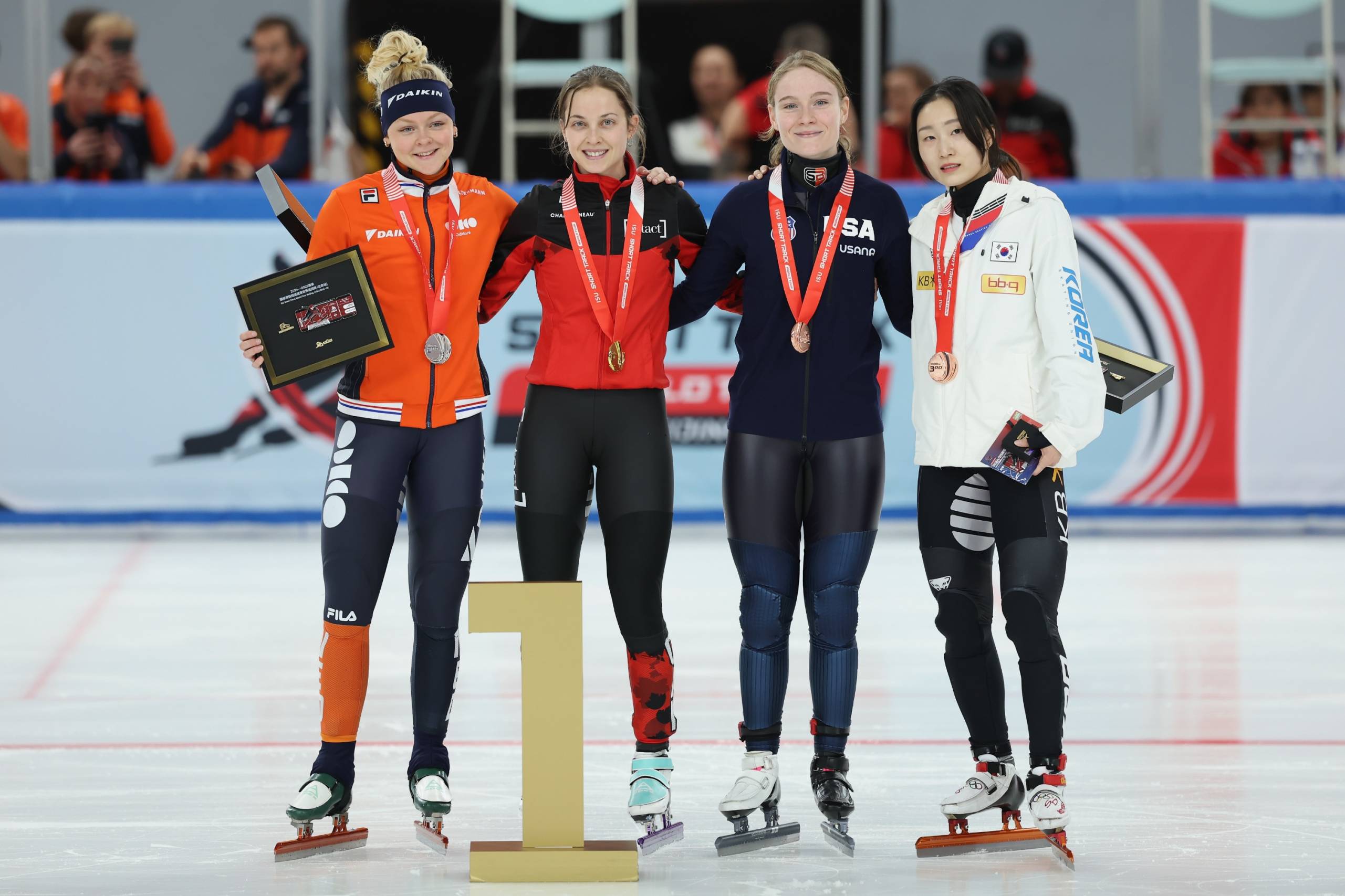 La Néerlandaise Xandra Velzeboer, Danaé Blais, l’Américaine Corinne Stoddard et la Coréenne Choi Min Jeong ont complété le podium du 1 000m. (Photo : Gracieuseté – International Skating Union via Getty Images)